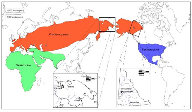 قلمرو شیرها در گذشته:آبی:شیر امریکایی-قرمز:شیر غار-سبز:شیر افریقایی و ایرانی-نقشه از صفحه ی "شیر غار" در ویکی پدیا