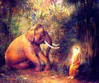 با این حال در هند بوداییان میگفتند که چگونه پیلی وحشی توسط بودا رام شد.فیل درواقع نماد نیروهای مادی بود که به اطاعت انسان آگاه درمی آید و انسان است که بر فیل یعنی مادیات ریاست میکند و نه بالعکس.یک انسان در مقابل نیروهای مادی درست به مانند مردی بی سلاح در مقابل فیلی وحشی بیدفاع است.با این حال،بودا با نیروی روح خود،فیل خشمگین مادیات را رام کرد.پس انسان با تکیه بر روحانیت خود میتواند از تبدیل شدن به علف خورده شده جلوگیری کند.این شاید میراث فکری ای باشد که برخی از اجداد ما با نگریستن به فیل سوری به آن می اندیشیدند.